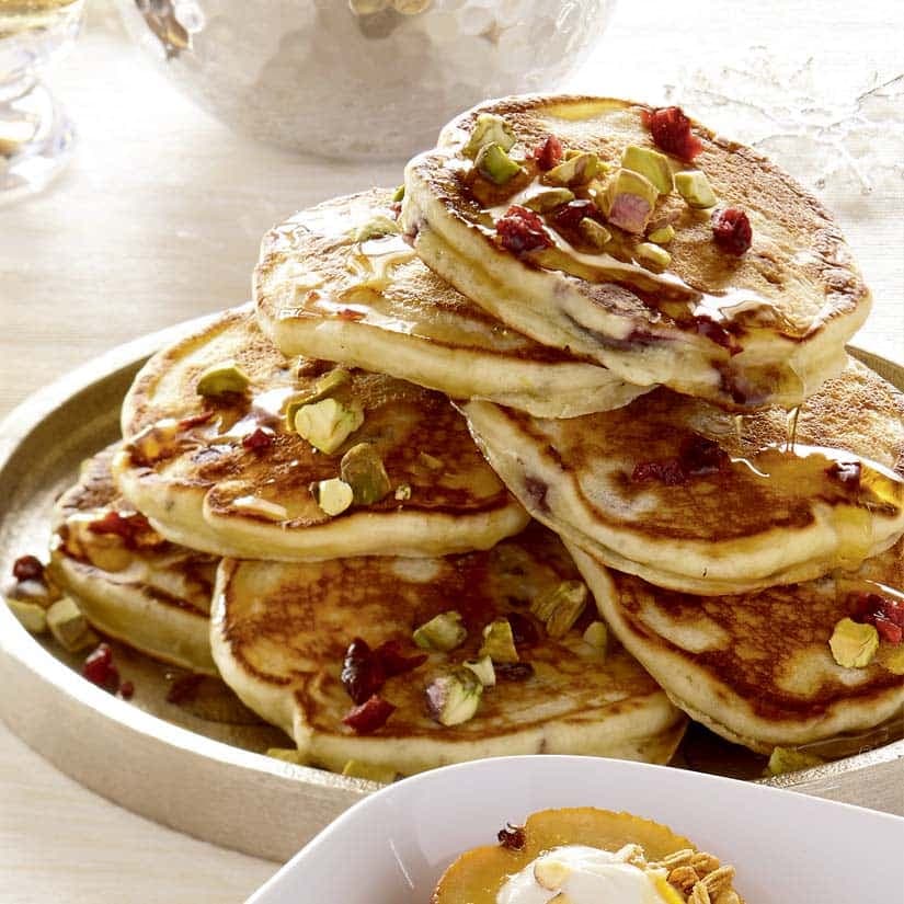 - Servir les pancakes chauds, arrosés de sirop d'érable et de pistaches et canneberges séchées, si désiré.