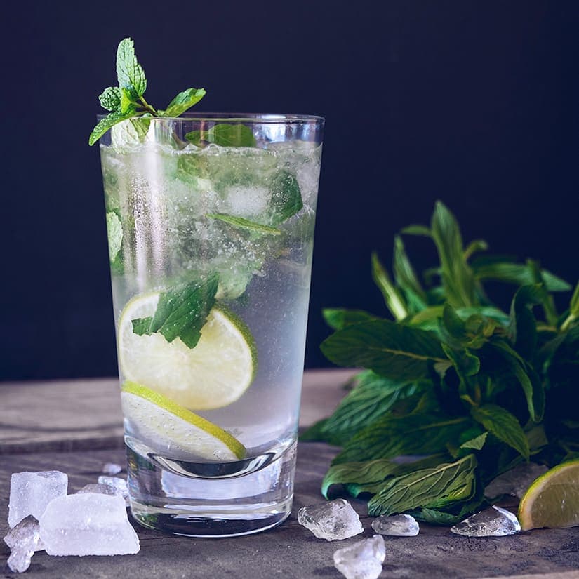 - Presser le jus de lime dans un long verre refroidi. Ajouter le sucre et la menthe et écraser le tout dans le fond du verre jusqu'à dissolution complète du sucre. Remplir le verre avec des glaçons concassés et ajouter le rhum.