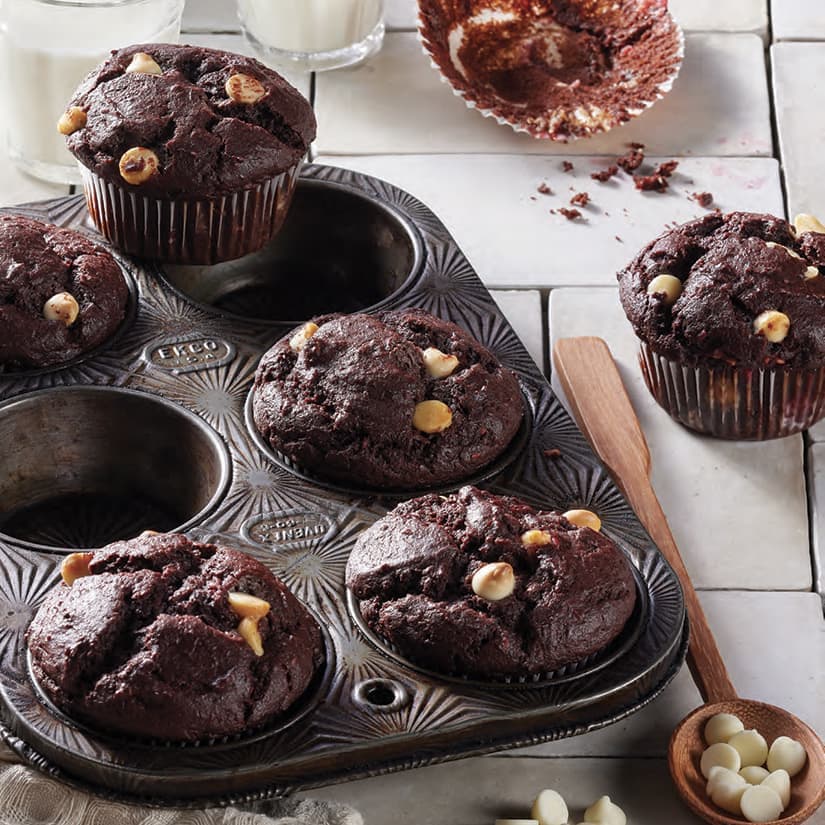 - Répartir la pâte dans 12 moules à muffins tapissés de moules en papier ou légèrement beurrés. Cuire au four 25 minutes ou jusqu'à ce qu'un cure-dents piqué au centre des muffins en ressorte propre. Mettre les moules sur une grille et laisser refroidir 5 minutes. Retirer les muffins des moules et laisser refroidir complètement sur la grille. (Les muffins se conserveront jusqu'à 3 jours au réfrigérateur ou jusqu'à 3 mois au congélateur.)