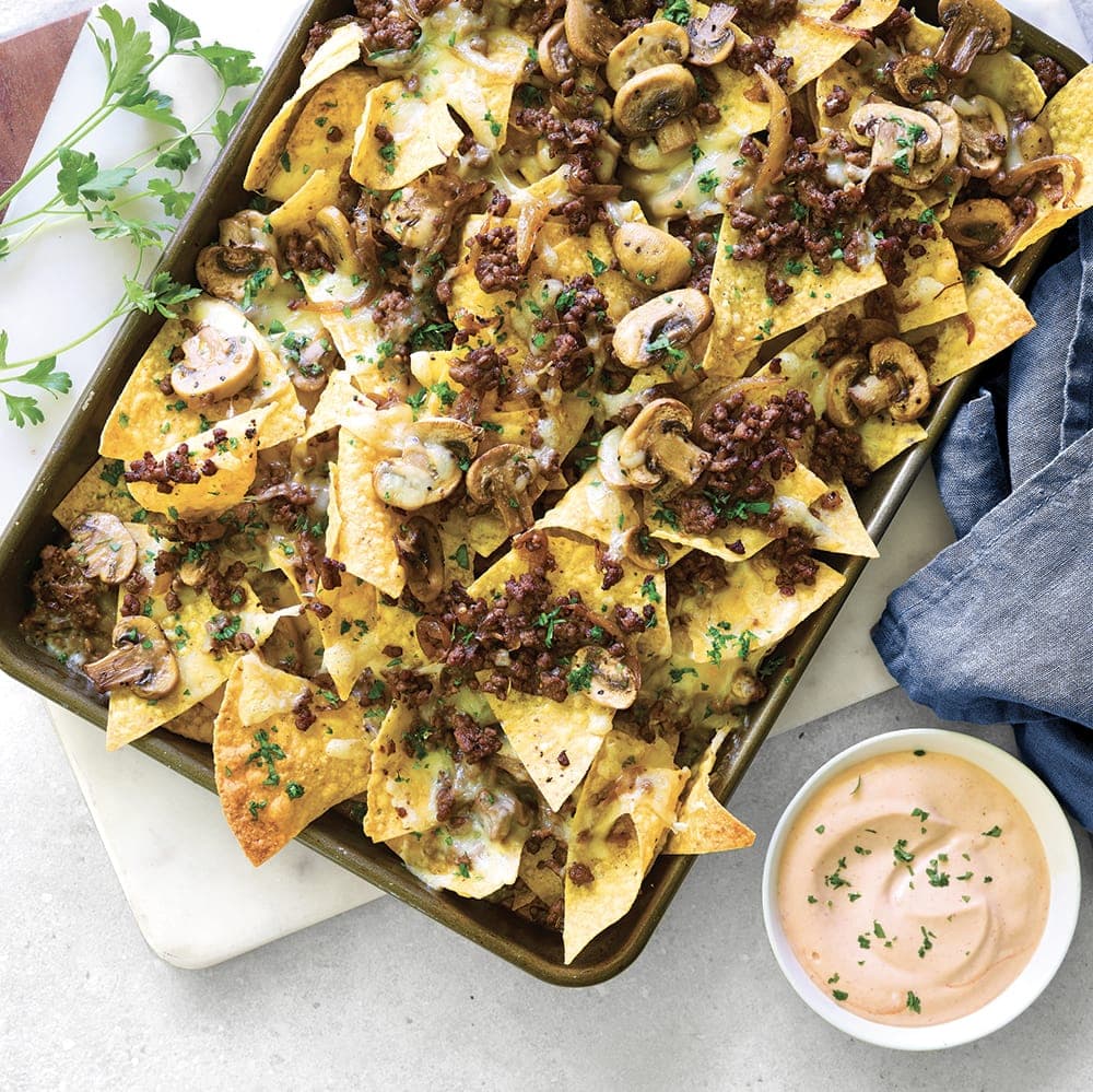 Sur une grande plaque de cuisson, répartir la moitié des croustilles, puis la moitié du mélange de viande. Couvrir de la moitié du fromage. Répéter avec le reste des ingrédients.