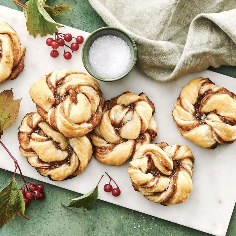 - À l'aide d'une roulette à pizza ou d'un couteau d'office, tailler la pâte en bandes de 1 po (2,5 cm) de large. Torsader chaque bande sur elle-même, puis assembler en forme de nœud (ou de chignon), en rabattant les bouts par-dessous. Déposer les nœuds sur la plaque, en les espaçant légèrement. Cuire au centre du four, de 15 à 18 minutes (ou jusqu'à ce que la pâte soit bien dorée). Saupoudrer d'un peu de sucre cristal, si désiré. (Les nœuds à la cannelle se conserveront jusqu'à 3 jours dans un contenant hermétique ou jusqu'à 3 mois au congélateur).