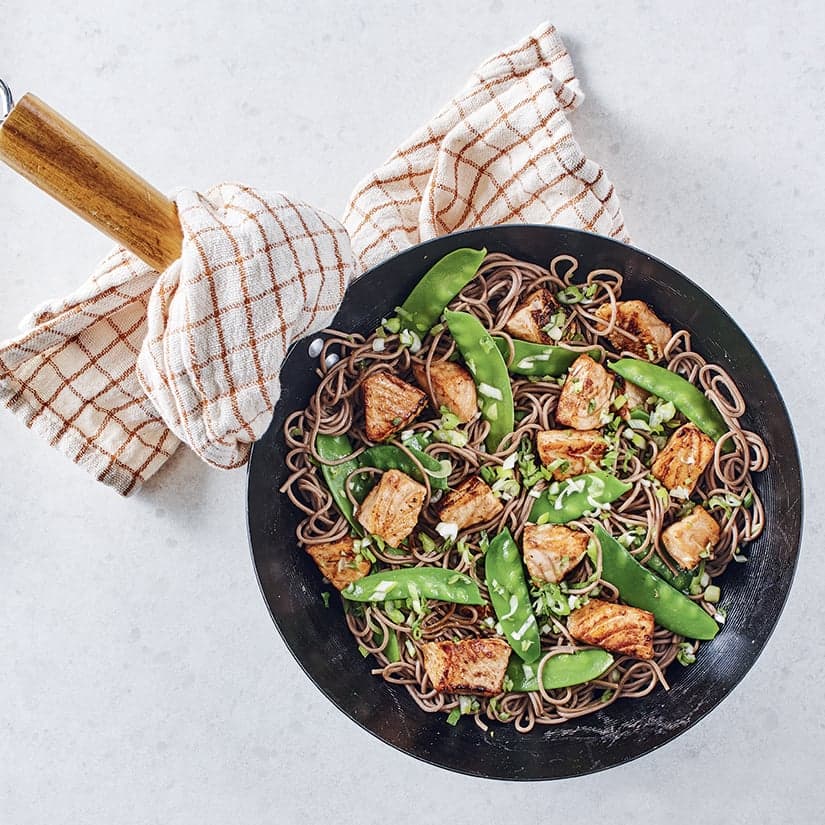 - Dans le poêlon, ajouter les nouilles, les pois mange-tout et le reste de la sauce. Mélanger pour bien enrober les nouilles. Cuire 2 minutes à feu moyen. Répartir les nouilles dans des bols. Garnir du saumon réservé et des oignons verts.