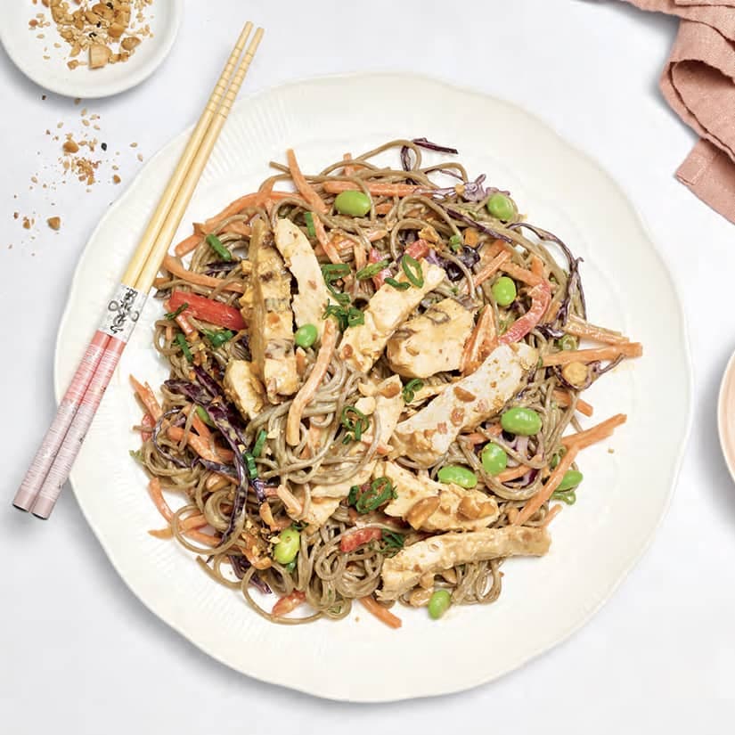 - Dans le mélangeur, mettre 3/4 t (180 ml) de beurre d'arachide crémeux, 1/3 t (80 ml) de sauce soya à teneur réduite en sel, 3/4 t (180 ml) d'eau de cuisson des nouilles, 3 c. à soupe (45 ml) de vinaigre de riz non assaisonné, 3 c. à soupe (45 ml) de sirop d'érable, 2 c. à soupe (30 ml) de gingembre frais haché, 1 c. à soupe (15 ml) d'huile de sésame grillé et 1 gousse d'ail grossièrement hachée. Pulser jusqu'à l'obtention d'une consistance lisse.