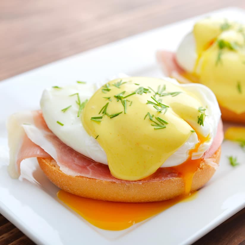 - Entre-temps, couper les muffins anglais en deux horizontalement et les faire griller. Mettre deux moitiés de muffin anglais, le côté coupé dessus, dans chaque assiette. Garnir chacune d'une tranche de jambon, d'un oeuf poché réservé et de 2 c. à tab (30 ml) de la sauce hollandaise réservée.