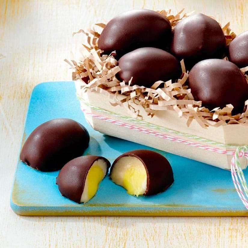 - Prendre 1 c. à tab (15 ml) de la préparation blanche et l'aplatir en une rondelle de 1/4 po (5 mm) d'épaisseur. Placer une boule jaune au centre et la couvrir de la préparation blanche. Façonner de manière à former un œuf. Procéder de la même manière avec le reste des préparations (les remettre au congélateur quelques minutes si elles deviennent trop fondantes). Déposer les œufs sur la plaque de cuisson et mettre au congélateur environ 30 minutes.