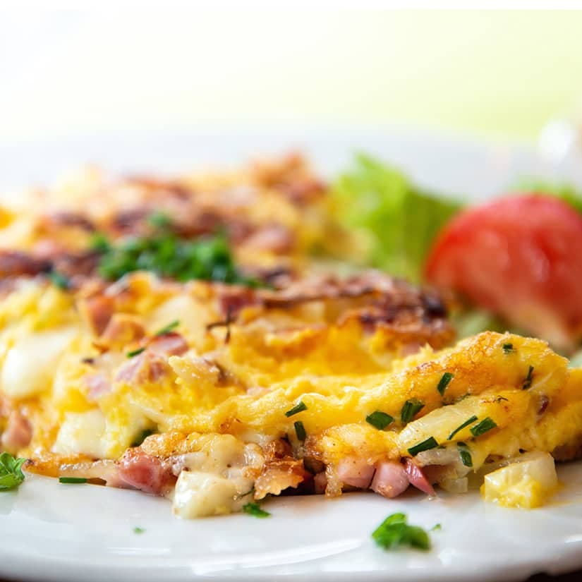 - Mettre environ le quart du poivron vert, de l'oignon vert et du jambon sur la moitié de l'omelette. Plier l'omelette en deux sur la garniture et poursuivre la cuisson pendant environ 2 minutes ou jusqu'à ce que l'omelette ait pris. Glisser l'omelette dans une assiette. Répéter avec le reste des ingrédients de manière à obtenir quatre omelettes.