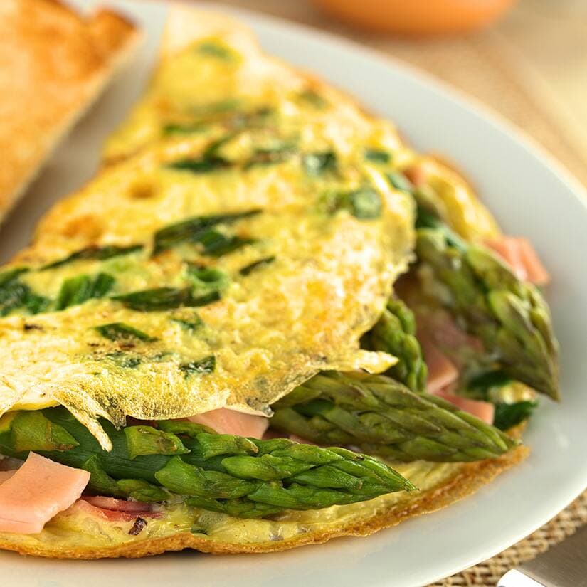 2. Déposer 3 des asperges et 1 tranche du jambon sur la moitié de l'omelette. Plier l'omelette en deux sur les asperges et poursuivre la cuisson pendant 2 minutes. Glisser l'omelette dans une assiette. Préparer trois autres omelettes de la même manière.