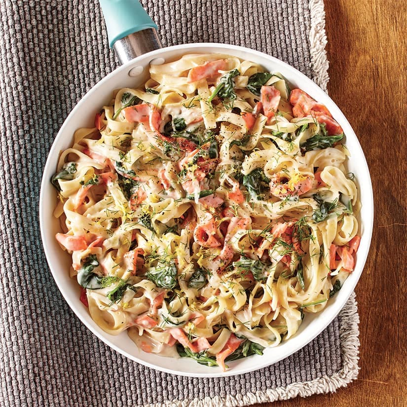 One-pot pasta au saumon fumé et aux épinards