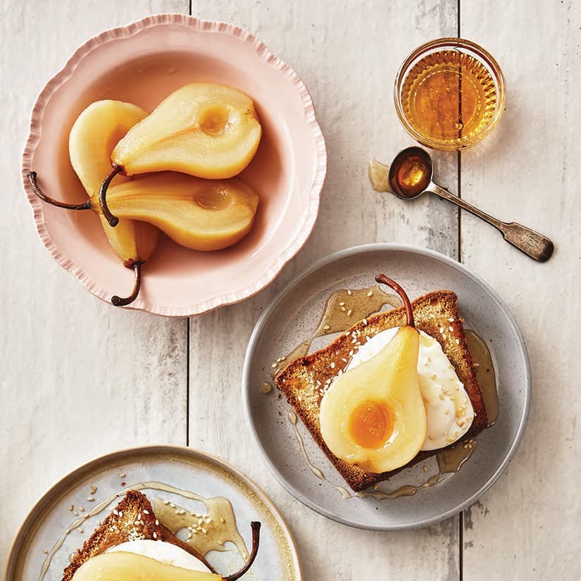 - Au moment de servir, déposer une tranche de pain aux épices dans une assiette. Garnir de crème fraîche au sésame rôti et d'une demi-poire pochée. Arroser du sirop de pochage réduit. Répéter avec le reste des ingrédients.