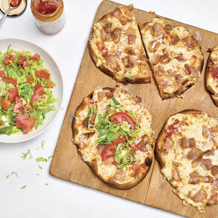 - Déposer les pains naans sur une grande plaque de cuisson. Étendre les deux sauces sur le dessus. Garnir des deux fromages et du bacon. Cuire au four de 12 à 15 minutes, ou jusqu'à l'obtention d'une belle coloration. Répartir la laitue et les tomates sur les pains plats. Saler et poivrer. Garnir de piment fort, si désiré.