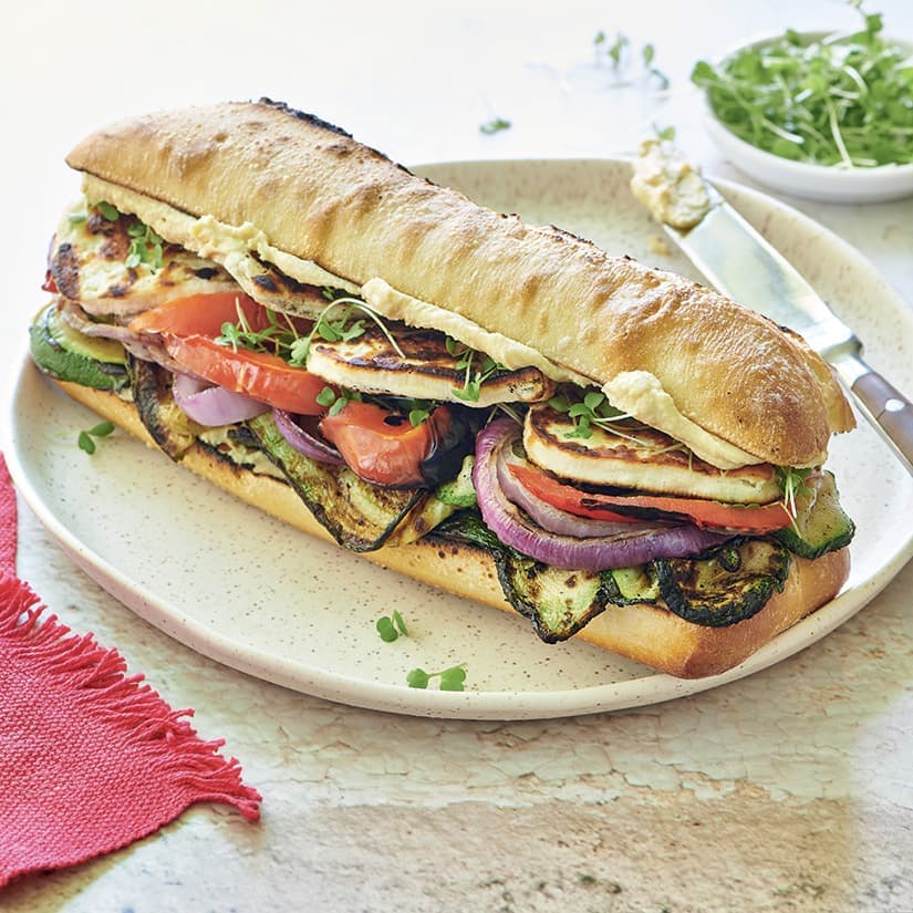 - Badigeonner l'intérieur de chaque pain d'houmous. Garnir les pains avec les légumes, quelques tranches de fromage grillé et des micropousses. Refermer et badigeonner légèrement l'extérieur des pains avec 1 c. à soupe/15 ml d'huile d'olive.