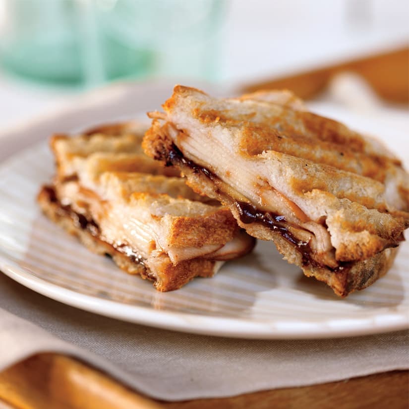 2. 2. Mettre les sandwichs, deux à la fois, dans le presse-paninis. Fermer le couvercle et cuire pendant environ 2 minutes ou jusqu'à ce que le chocolat commence à fondre. Couper les paninis en deux sur le biais et servir aussitôt.