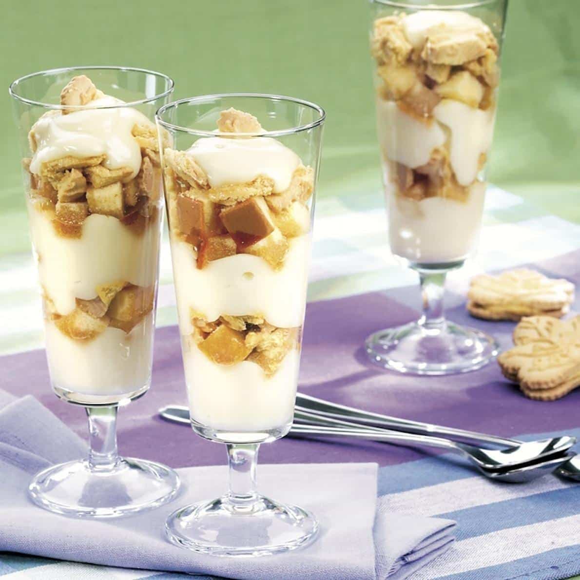 - 2. Dans chacune des quatre coupes à dessert, mettre 1/4 t (60 ml) du pouding, 2 c. à tab (30 ml) des cubes de gâteau, 2 c. à tab (30 ml) des biscuits hachés et 1 c. à thé (5 ml) du sirop d'érable. Répéter avec le reste du pouding, des cubes de gâteau, des biscuits hachés et du sirop d'érable, en terminant avec 1 c. à thé (5 ml) du pouding. Décorer chaque coupe d'un morceau de biscuit réservé.