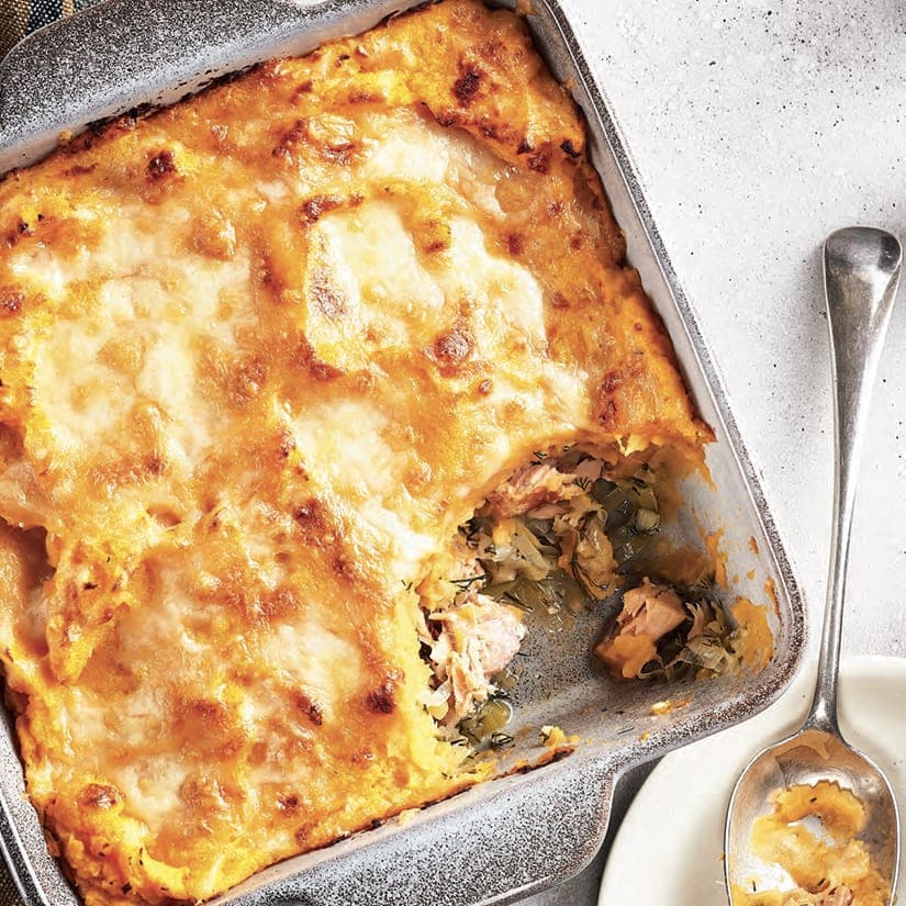 - Lorsque les patates sont cuites, les égoutter, puis les réduire en purée, avec le beurre et le lait. Saler et poivrer. Étendre la purée sur le saumon, puis recouvrir de fromage. Cuire sur la grille supérieure du four de 25 à 30 minutes ou jusqu'à ce que le fromage soit bien gratiné. Garnir avec de l'aneth ou du persil frais avant de servir.