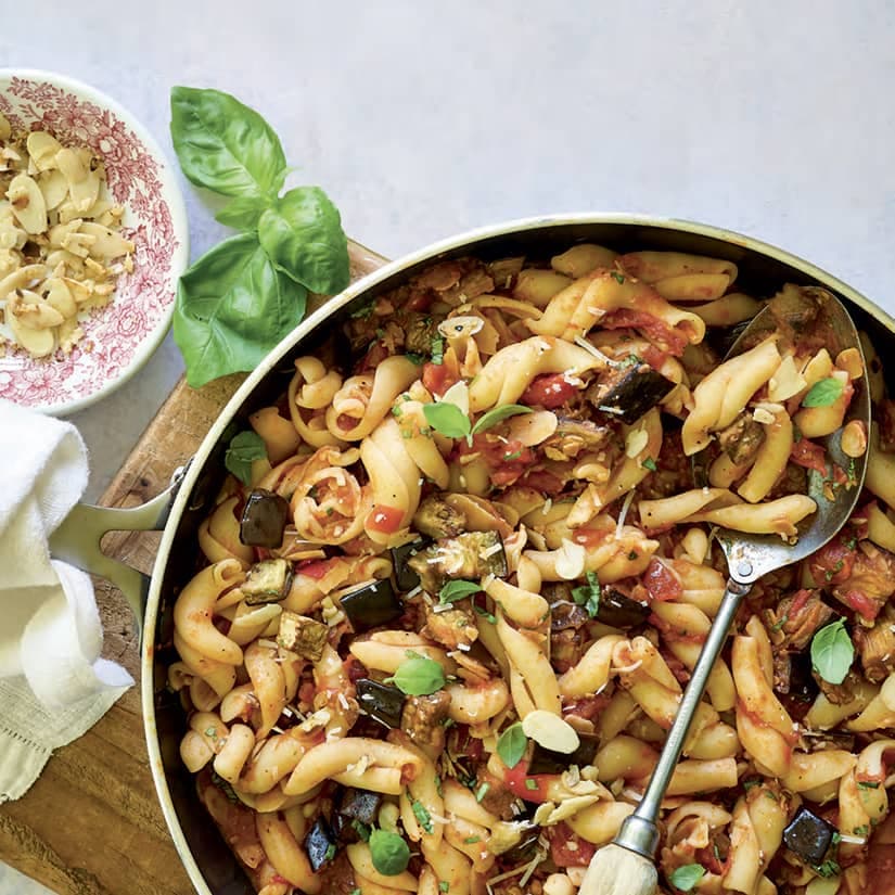 - Dans une grande poêle, chauffer l'huile d'olive à feu moyen-élevé. Faire revenir l'ail, les anchois et les amandes de 1 à 2 minutes. Ajouter les tomates et faire revenir 1 minute de plus. Verser la moitié de l'eau de cuisson, puis mélanger. Ajouter la sauce tomate ainsi que l'aubergine frite. Mélanger et défaire en écrasant légèrement l'aubergine. Ajouter les pâtes, mélanger et cuire de 1 à 2 minutes. Saler et poivrer, puis ajouter un peu plus d'eau de cuisson si nécessaire, jusqu'à l'obtention de la consistance désirée. Garnir de pecorino (ou de parmesan) râpé et de basilic frais, si désiré.