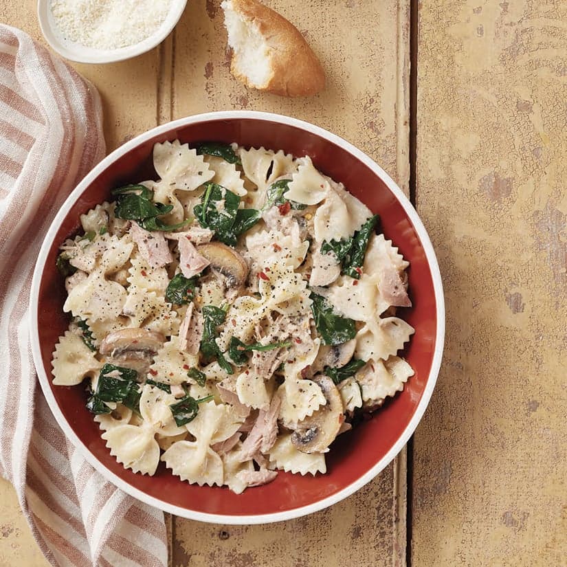 - Dans le poêlon, ajouter les pâtes avec le thon et les épinards, et mélanger délicatement pour bien les enrober. Réchauffer le tout en remuant jusqu'à ce que les épinards aient ramolli. (Au besoin, ajouter le reste de l'eau de cuisson réservée pour obtenir des pâtes plus crémeuses.) Saler et poivrer. Servir aussitôt, parsemé du reste du parmesan.