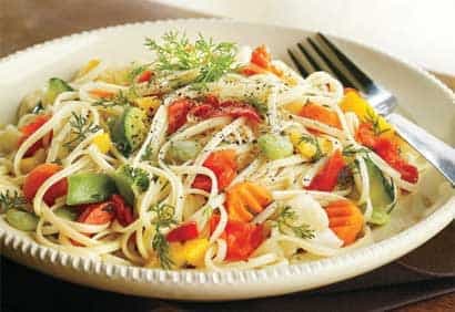 - Ajouter les légumes aux pâtes réservées et mélanger délicatement (ajouter de l'eau de cuisson, au besoin). Ajouter la truite fumée et l'aneth haché et bien mélanger. Garnir de brins d'aneth, si désiré.