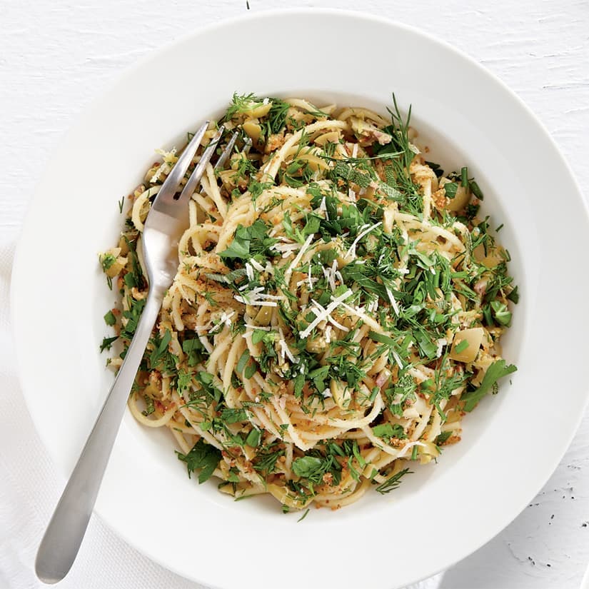 - Dans un grand bol, mélanger les olives vertes, le zeste de citron et les fines herbes. Verser l'huile d'olive et ajouter la chapelure, les pâtes et l'eau de cuisson réservée. Saler, poivre et mélanger. Parsemer de parmesan râpé, si désiré.