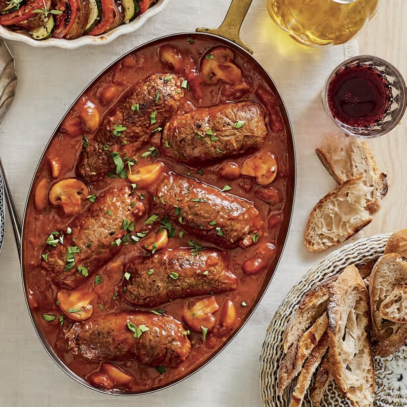 - Ajouter les champignons dans la poêle et les faire dorer de 3 à 4 minutes, en les remuant une seule fois à mi-cuisson. Ajouter le vin et faire réduire de moitié en remuant, de 2 à 3 minutes. Ajouter le reste des ingrédients et porter à ébullition. Saler et poivrer. Réduire à feu doux. Remettre les paupiettes dans la poêle, couvrir, et cuire 30 minutes. Retirer le couvercle et cuire 15 minutes de plus ou jusqu'à ce que la sauce ait la consistance désirée. Garnir de persil et accompagner de pommes de terre rôties, si désiré.
