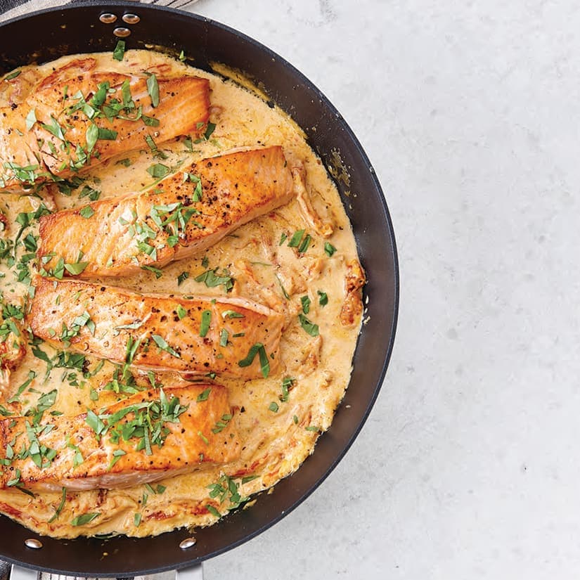 - Remettre le saumon dans le poêlon et réchauffer 1 minute. Parsemer du basilic. Servir avec des pâtes, du riz ou des légumes verts, si désiré.