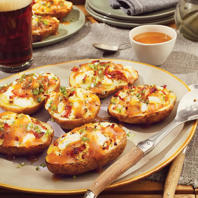 - Mettre les pommes de terre garnies dans une assiette de service. Arroser de la sauce chaude et parsemer du reste des oignons verts.