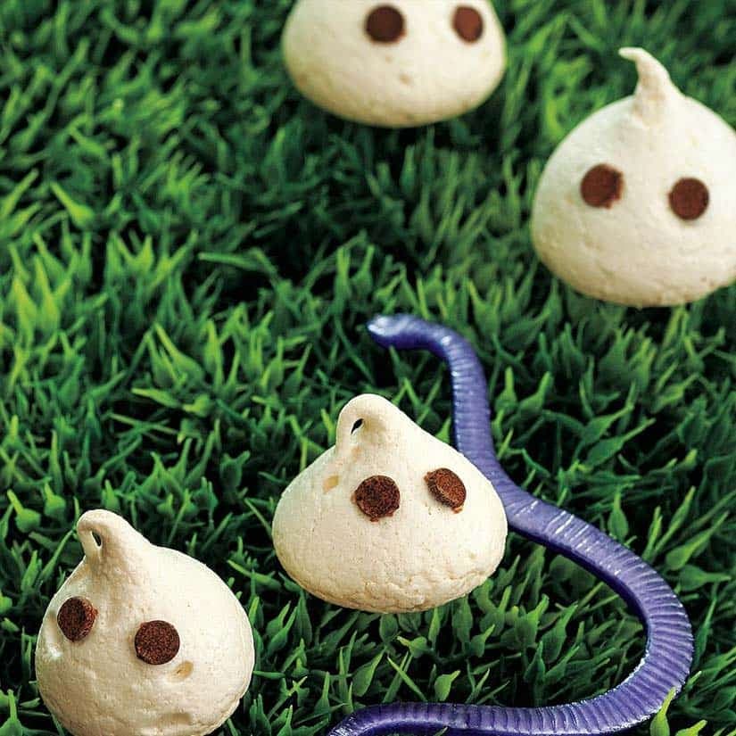 - À l'aide d'une poche à douille munie d'un embout rond de 3/4 po (2 cm), former des rosettes de meringue de 1 po (2,5 cm) sur deux plaques à biscuits tapissées de papier-parchemin. Mettre deux brisures de chocolat sur chaque meringue pour former les yeux.
