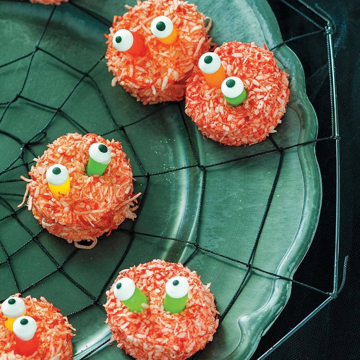 - Mettre les flocons de noix de coco colorés dans une assiette, y passer les rondelles de guimauve pour bien les enrober de chaque côté et secouer pour enlever l'excédent. Insérer 2 bonbons durs à la verticale, en les tournant, sur le dessus de chaque rondelle de guimauve pour former les yeux. Mettre un peu du chocolat fondu au dos de chaque bonbon en forme d'oeil et le fixer sur le bout de chaque bonbon dur. Déposer les petits monstres sur une plaque à biscuits tapissée de papier ciré et laisser sécher pendant environ 20 minutes.