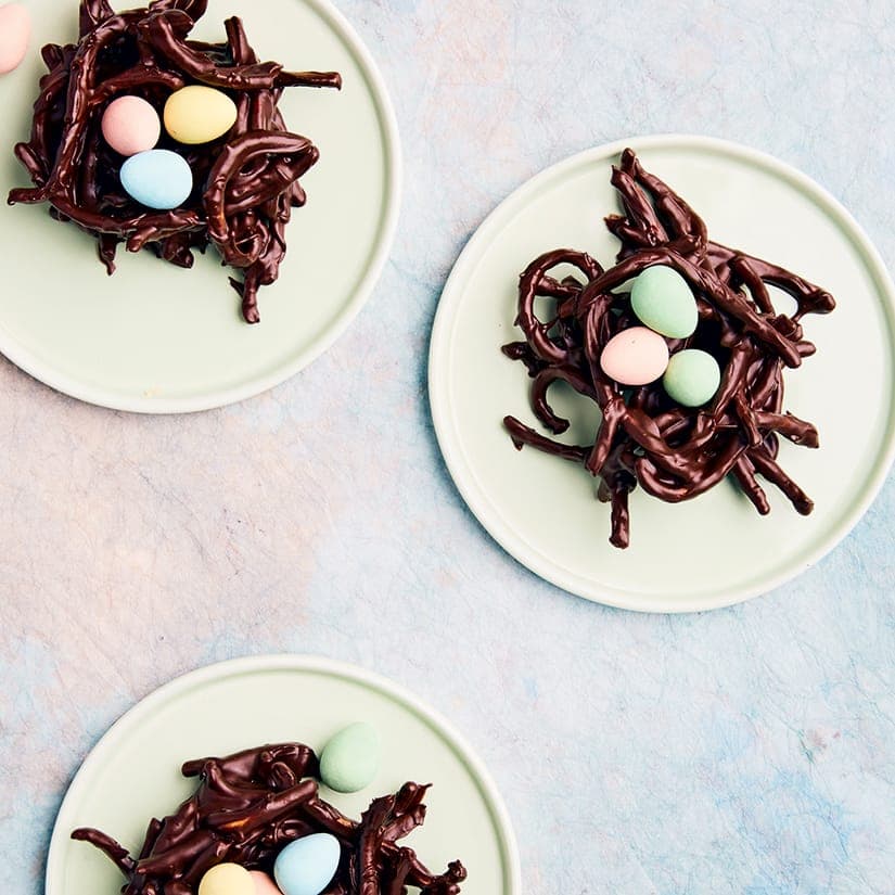 2. Sur une plaque de cuisson tapissée de papier parchemin, laisser tomber la préparation, environ 1 c. à tab comble (20 ml) à la fois. Faire une petite cavité au centre de chaque nid avec le dos de la cuillère. Répartir les œufs dans les nids. Réfrigérer 20 minutes ou jusqu'à ce que le chocolat ait durci. (Les nids se conserveront jusqu'à 2 jours dans un contenant hermétique au réfrigérateur. Laisser revenir à la température ambiante 15 minutes avant de servir.