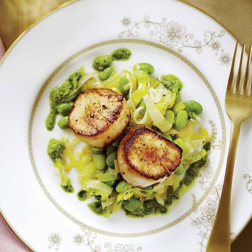 Pétoncles poêlés au citron sur lit de poireaux