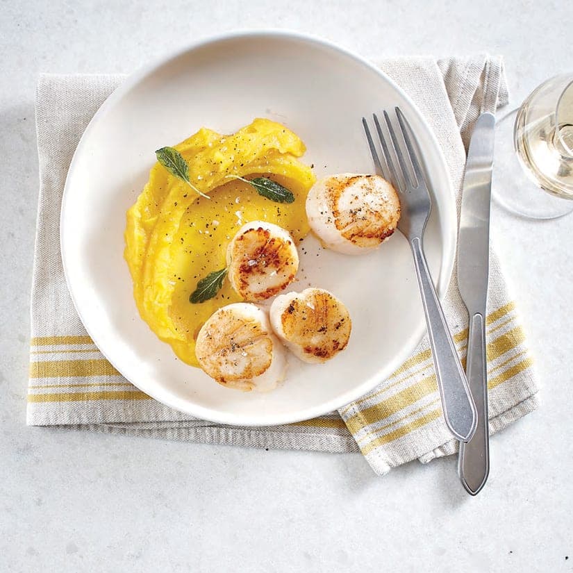 - Répartir la purée dans des assiettes. Garnir des pétoncles et de la sauge réservés. Saler et poivrer. Parsemer des noix de pin, si désiré.