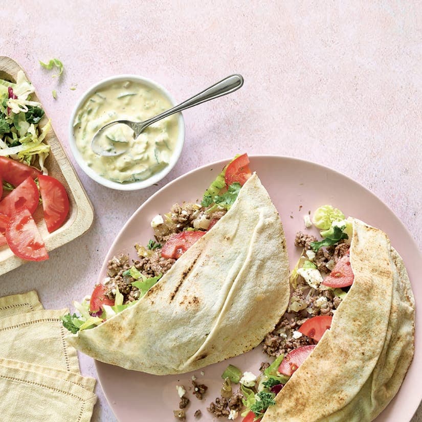 Une recette rapide et savoureuse qui marie le bœuf haché maigre à des saveurs méditerranéennes : assaisonnement à la grecque, zeste de citron, feta émiettée et fines herbes fraîches. Servie dans des pains pitas garnis de légumes croquants et accompagnée d’une tartinade au concombre, cette option est parfaite pour un repas léger et équilibré, prêt en moins de 30 minutes.