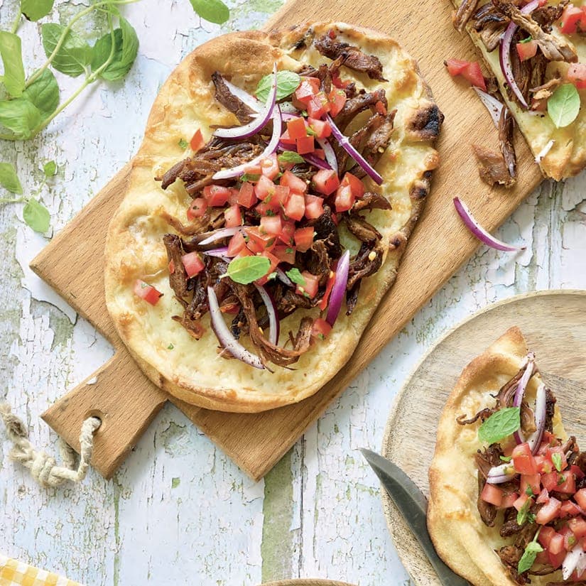 - Répartir la viande, l'oignon, le sumac et la tomate sur les pains naans. Cuire au four de 1 à 2 minutes.