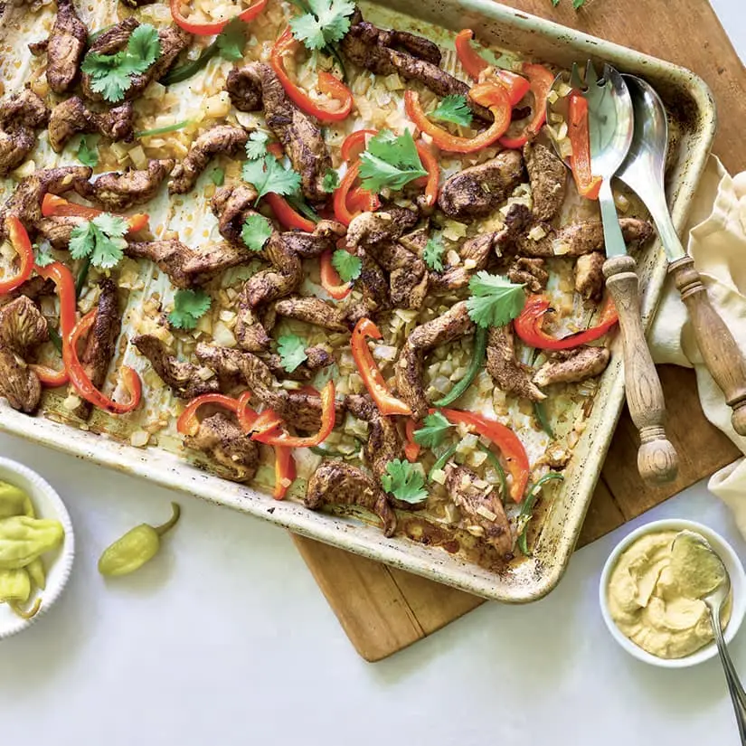 - Dans un bol, mélanger l'huile et l'assaisonnement. Ajouter le poulet et bien mélanger. Déposer sur une plaque de cuisson. Cuire 8 minutes au four. Ajouter l'oignon, le poivron et les piments, puis mélanger. Cuire 8 minutes ou jusqu'à l'obtention d'une belle coloration. Ajouter l'ail, puis cuire 2 minutes. Déposer la plaque au centre de la table. Servir avec du houmous, des pains pitas, des navets et des piments marinés et de la coriandre, si désiré.