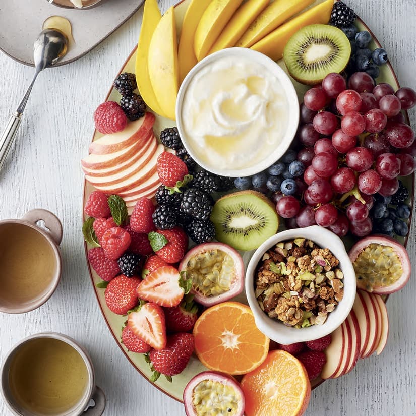 - Répartir les fruits choisis autour des bols, sur toute la surface de l'assiette.
