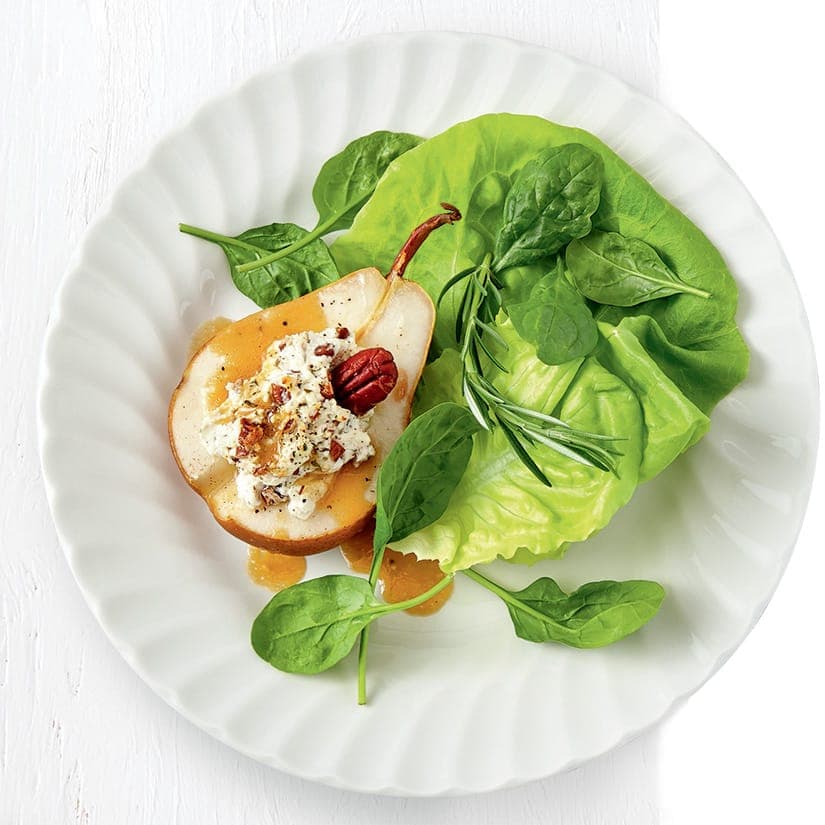 - Couper la poire en deux sur la longueur et retirer le cœur. Déposer les demi-poires dans un petit plat allant au four, côté peau vers le bas. Les badigeonner de jus de citron, puis les garnir de la préparation au fromage réservée et de 2 pacanes. Saler et poivrer.