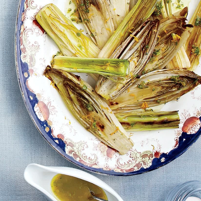 Poireaux et endives rôtis, vinaigrette aux agrumes