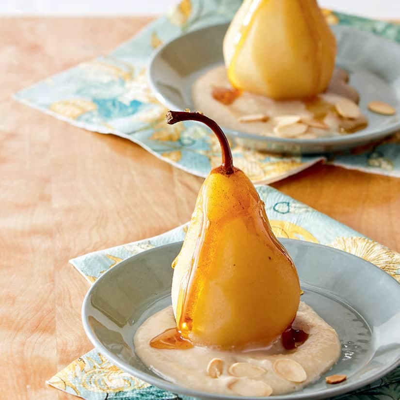 Poires pochées à l'érable et crème d'amandes