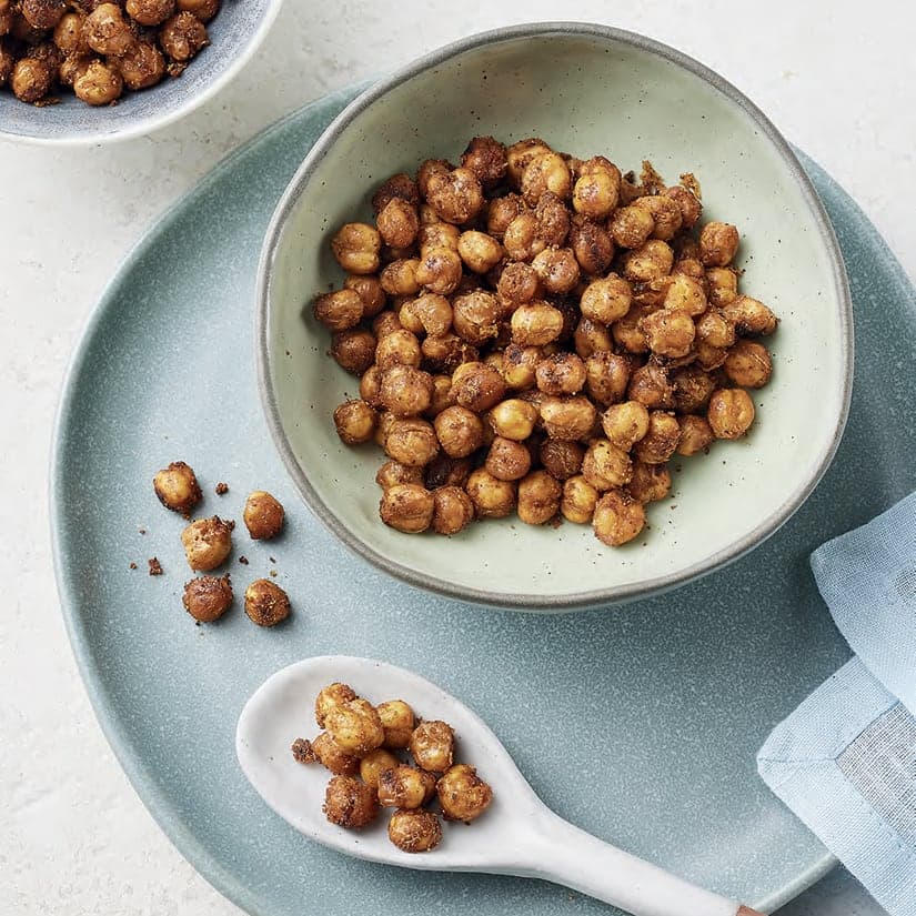 3. Vaporiser le panier d'une friteuse à air chaud avec un enduit végétal. Étendre les pois chiches dans le panier de la friteuse, en une seule couche, et cuire à 350 °F (180 °C) pendant 25 minutes ou jusqu'à ce qu'ils soient dorés et bien croustillants (secouer le panier toutes les 5 minutes). (Les pois chiches croustillants se conserveront jusqu'à 2 semaines à la température ambiante.)