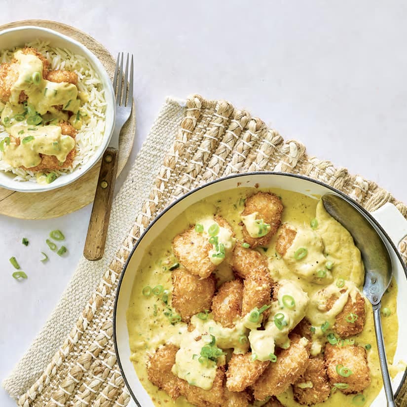 - Retirer presque toute l'huile de la poêle (conserver 1 c. à soupe/15 ml). Ajouter l'ail et le gingembre et faire revenir de 1 à 2 minutes. Ajouter le lait de coco, la pâte de curry et l'oignon vert. Porter à ébullition, puis ré- duire le feu à doux et laisser mijoter 2 minutes. Retirer du feu. Servir le poisson accompagné de riz, couvert de sauce. Garnir d'oignon vert, si désiré.