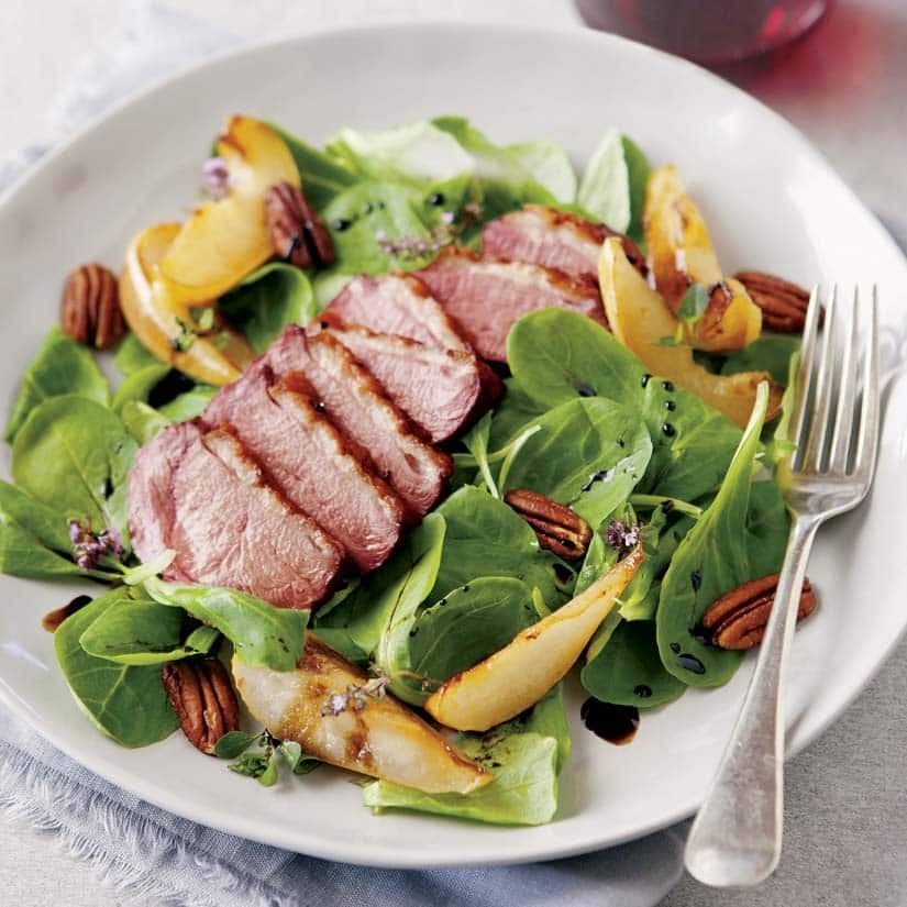 1. Au moment de servir, couper les poitrines de canard en tranches sur le biais. Répartir les verdures dans les assiettes et couvrir des tranches de canard. Garnir des poires réservées et des noix de Grenoble et arroser de la réduction balsamique. Décorer de brins de thym.