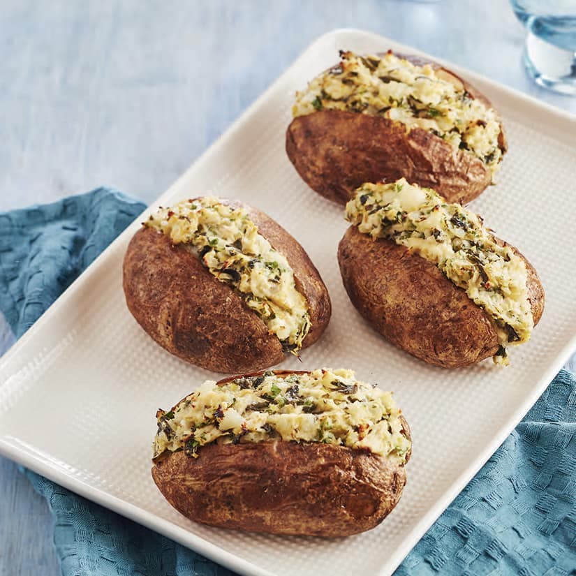 - Écraser la chair des pommes de terre à la fourchette. Ajouter la préparation de légumes, le poulet effiloché, les fromages et le persil. Saler et poivrer puis bien mélanger. Farcir les pelures de la garniture et enfourner les pommes de terre sur la grille supérieure du four cette fois. Cuire de 15 à 20 minutes ou jusqu'à ce que le dessus commence à dorer.
