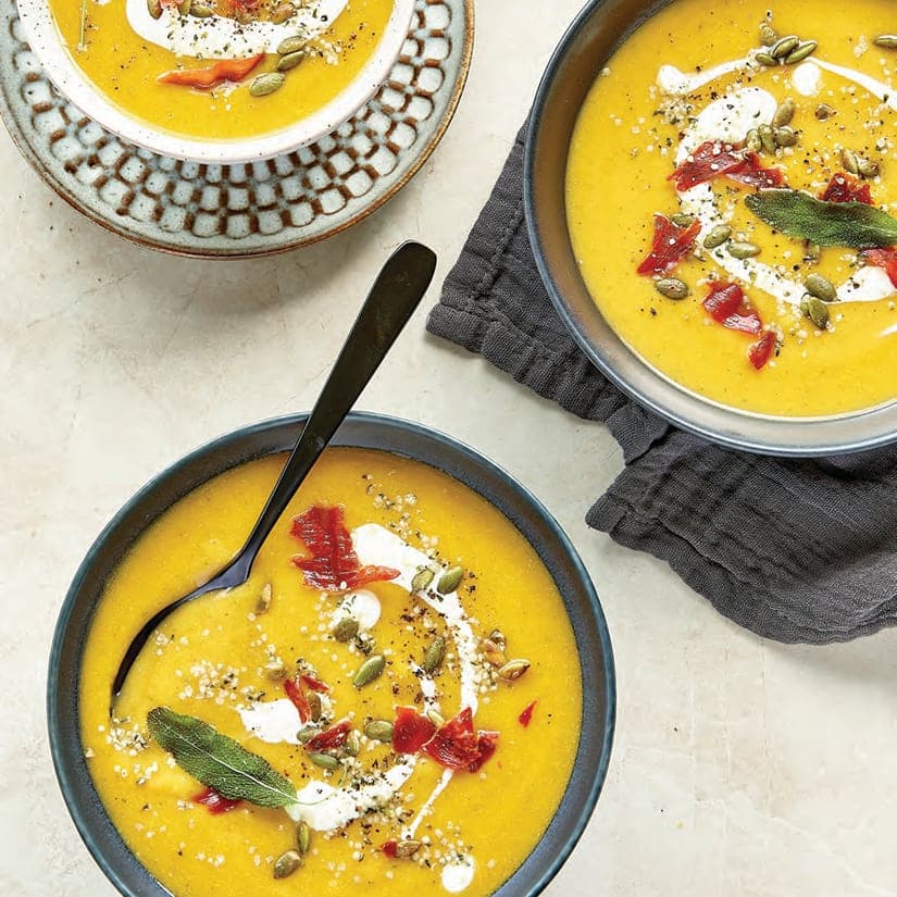 - Au moment de servir, répartir le potage chaud dans les bols de courge rôtie ou des bols traditionnels. Arroser d'un filet de crème, si désiré. Garnir des chips de prosciutto brisées en morceaux, des feuilles de sauge frites, des graines de citrouille et des graines de chanvre, si désiré.