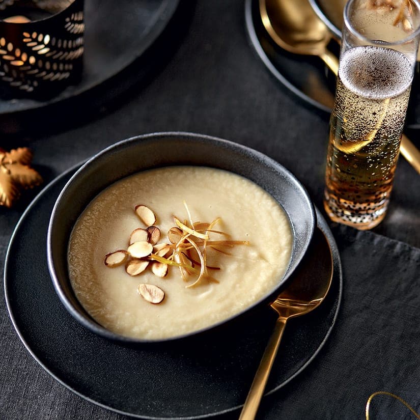 - Au moment de servir, répartir le potage chaud dans des bols. Garnir de la julienne de poireau frite et des amandes tranchées.