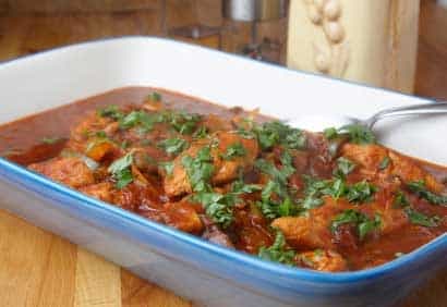 3. Retournez les morceaux de poulet. Ajoutez les poivrons - placez-les tout autour du poulet -, les tomates et 1/3 tasse (75 ml) d'eau. Portez à ébullition, baissez la température, couvrez et laissez mijoter de 20 à 30 minutes, jusqu'à ce qu'il n'y ait plus trace de rose au centre de la partie épaisse de la poitrine.