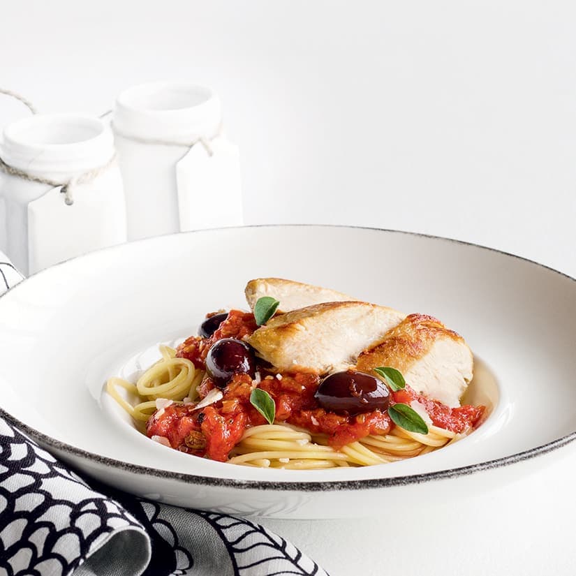 - Répartir les pâtes réservées dans des bols peu profonds. Napper de la sauce puttanesca et garnir des lanières de poulet. Parsemer de l'origan et du persil, si désiré.