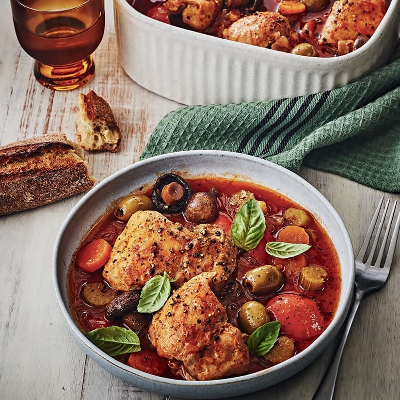 - Remettre le poulet dans la casserole et ajouter les olives. Saler et poivrer. Couvrir et faire cuire au centre du four pendant 1 heure 30 minutes.