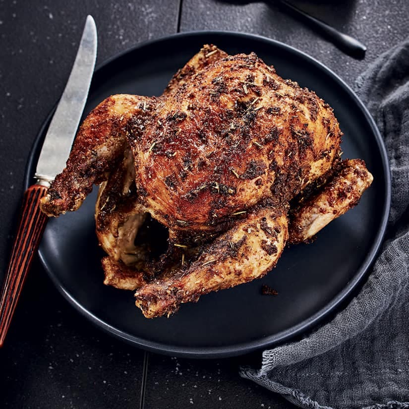 - Placer le poulet dans le panier de la friteuse à air, les poitrines vers le bas. Cuire pendant 15 minutes, puis retourner et cuire pendant 20 à 25 minutes de plus. Le poulet est prêt lorsqu'un thermomètre à viande inséré dans la chair (sans toucher à un os) indique 180 °F (82 °C). Déposer le poulet dans une assiette, recouvrir de papier d'aluminium (sans serrer) et laisser reposer de 10 à 15 minutes.