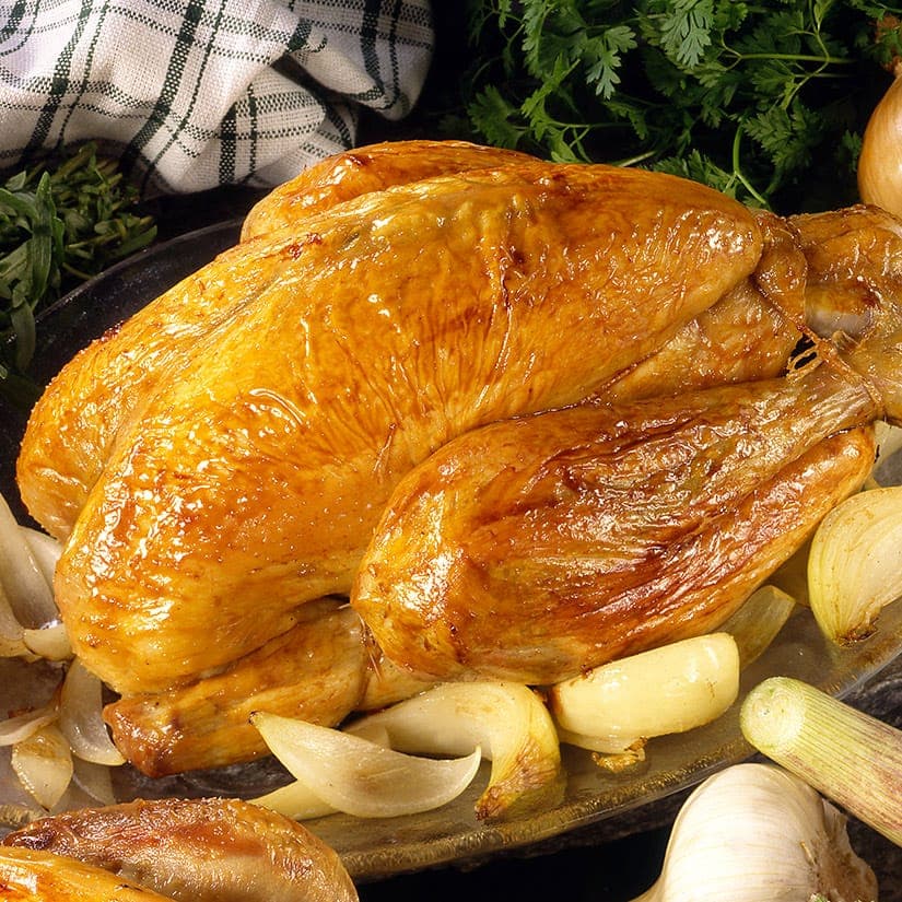 - Cuire au four préchauffé à 375°F (190°C) de 1 1/2 à 2 heures ou jusqu'à ce que le jus qui s'écoule du poulet lorsqu'on le pique avec une fourchette soit clair et que les légumes soient tendres et dorés (arroser le poulet du jus de cuisson de temps à autre en cours de cuisson). Mettre le poulet dans une assiette et le couvrir de papier d'aluminium, sans serrer. Laisser reposer pendant 10 minutes. Retirer la ficelle.
