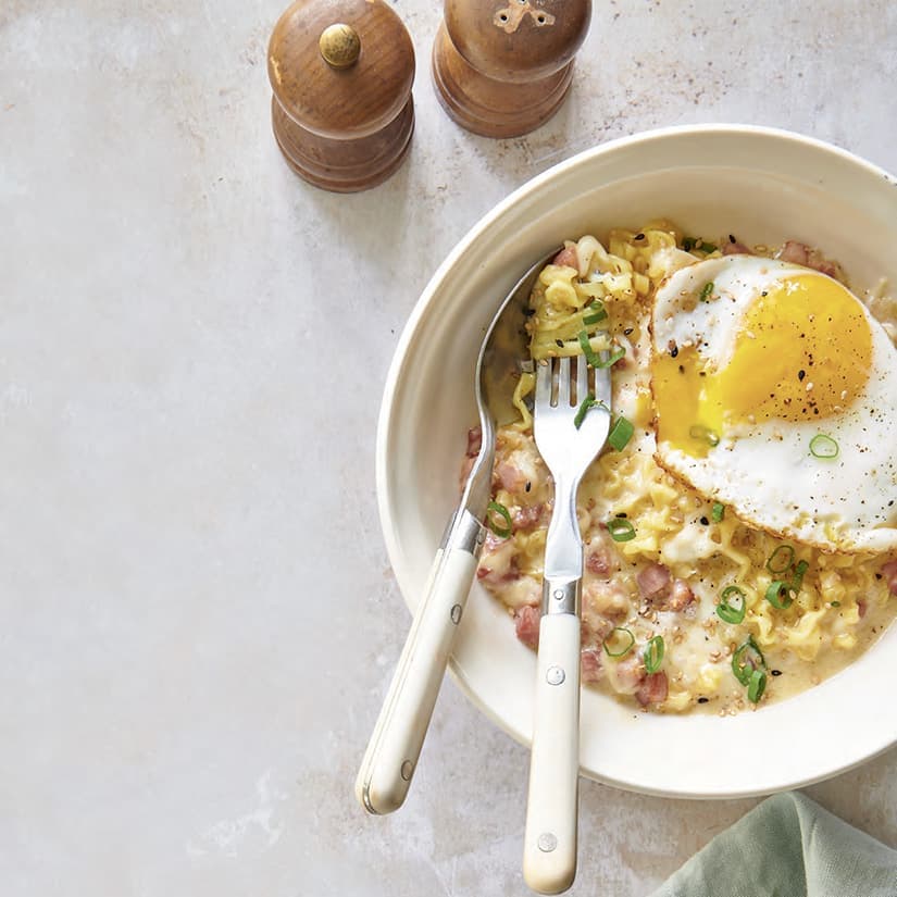 - Dans une grande poêle, chauffer l'huile à feu moyen-élevé. Faire revenir la pancetta de 3 à 4 minutes ou jusqu'à qu'elle soit dorée. Ajouter l'échalote et faire revenir pendant 1 minute. Ajouter la crème et le lait. Porter à ébullition, puis réduire le feu à moyen. Ajouter le fromage pecorino et mélanger. Ajouter les nouilles ramen directement dans la poêle (jeter les sachets d'assaisonnement). Couvrir et cuire 3 minutes environ. Retirer du feu. Ajouter le fromage mozzarella et remuer délicatement. Si les nouilles semblent trop sèches, ajouter un peu plus de lait, au besoin. Réserver au chaud.