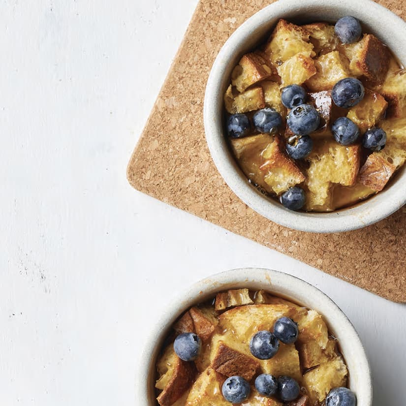 - 1. Préchauffer le four à 375 °F (190 °C). Répartir les cubes de pain dans des ramequins d'une capacité de 1 t (250 ml) chacun, beurrés ou huilés.